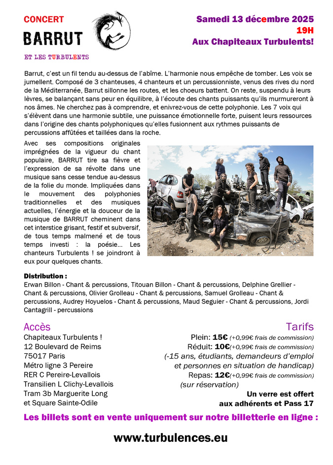 Le 13 décembre prochain à 19h, le groupe pose ses valises aux Chapiteaux le temps d’un concert polyphonique exceptionnel avec les chanteurs Turbulents! pour leur retrouvailles, après les Rencontres de chants polyphoniques de Calvi en 2015, et vous emmène en voyage avec eux dans leur univers occitan, musical, festif et poétique. Chœurs battants, chants puissants murmurés aux âmes, voilà les principaux ingrédients de cette polyphonie vocale à écouter et s’enivrer sans modération. Billetterie en ligne sur www.turbulences.eu aux Chapiteaux Turbulents !