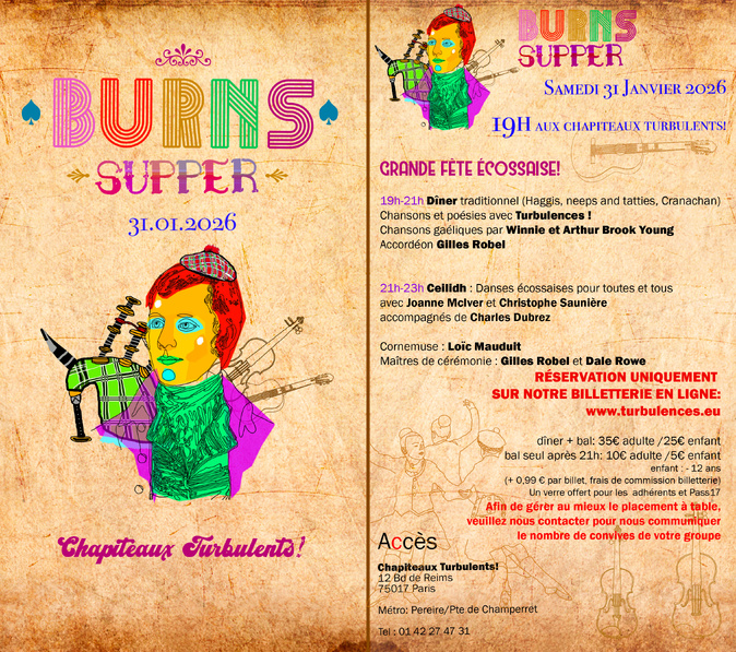 BURNS SUPPER - Samedi 31 janvier à 19hGRANDE FÊTE ÉCOSSAISE ! Grande fête écossaise BURNS SUPPERProgramme19h – 21h · Dîner traditionnelMenu : Haggis, neeps and tatties, Cranachan