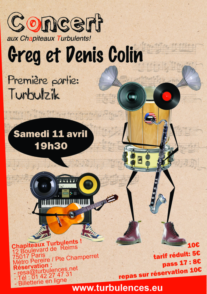 Turbulzik présente, enfin, aujourd’hui, quelques morceaux de son riche répertoire avec le plaisir d’être accompagné de Denis Colin et sa clarinette basse pour un moment de partage et d’échange. Ces turbulentes douceurs blues, rock, funk ou même bossa feront la première partie du duo Denis Colin et Grégory Colin (clarinette basse, guitare et chant).