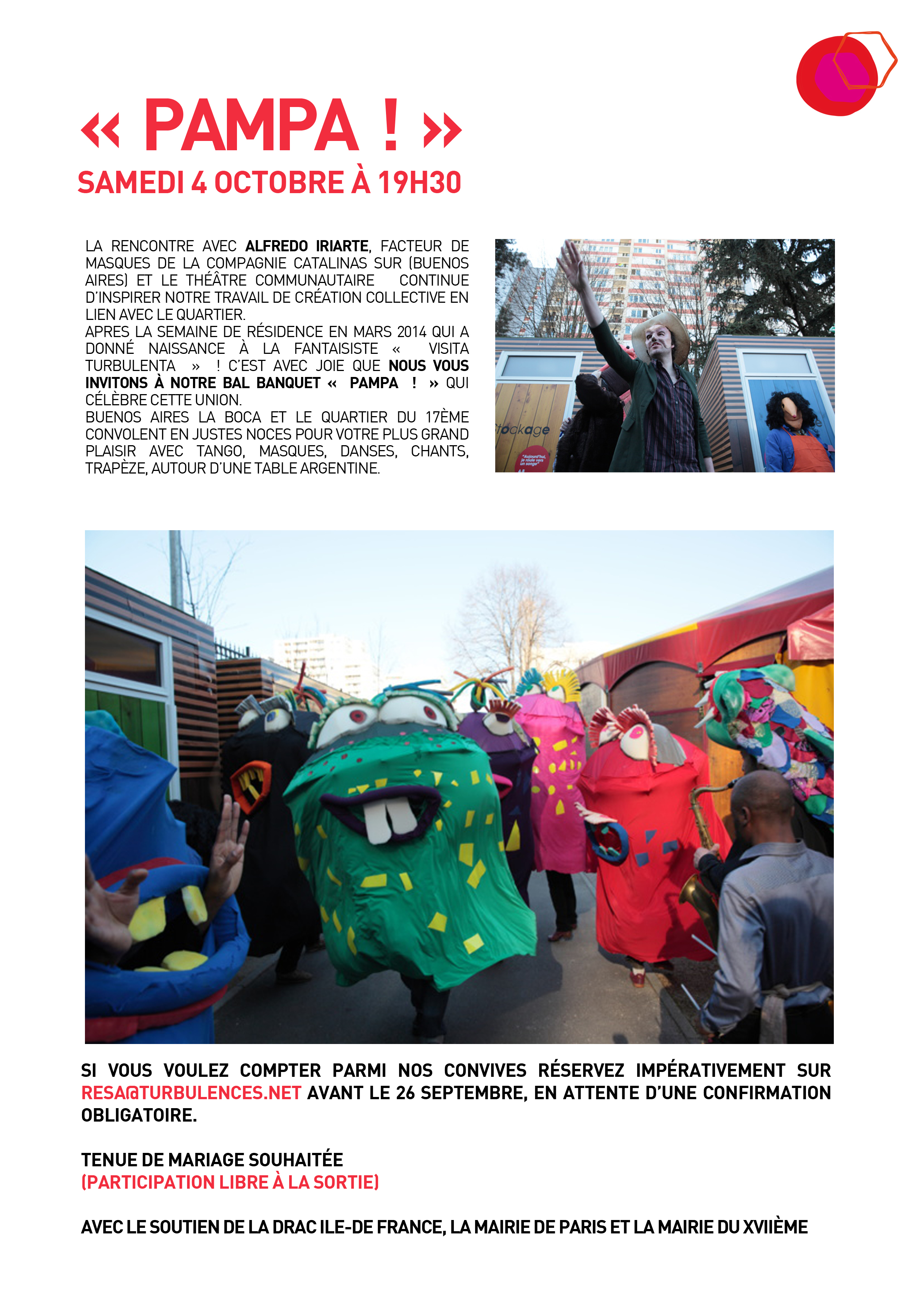 Apres la semaine de résidence en mars 2014 qui a donné naissance à la fantaisiste « Visita Turbulenta » ! c’est avec joie que nous vous invitons à notre BAL BANQUET « PAMPA ! » qui célèbre cette union.